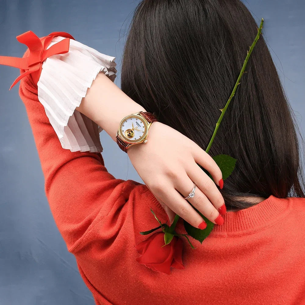 Vibrant and bold, the Amaka Étoile draws power from passion. Its white dial with crystal aperture and fuchsia strap symbolizes unrestrained confidence, designed for women who command both beauty and will.