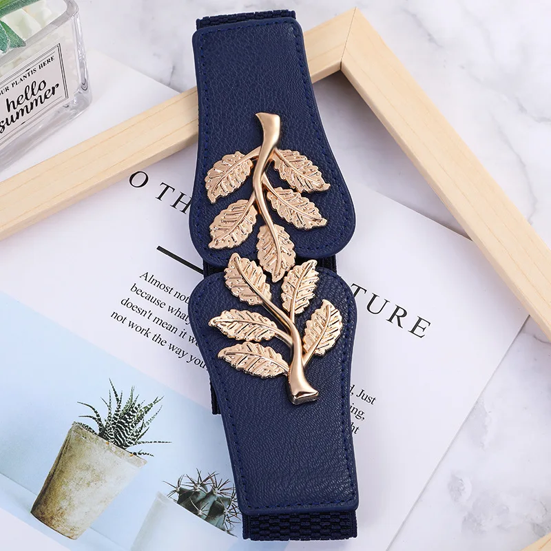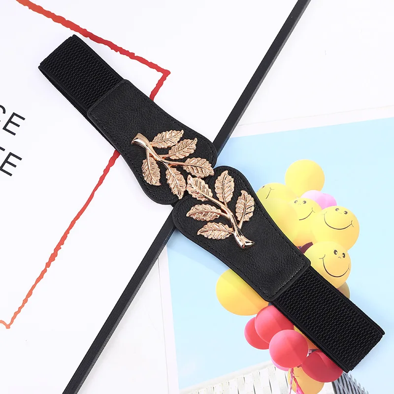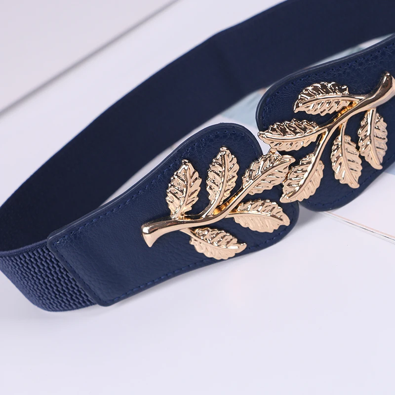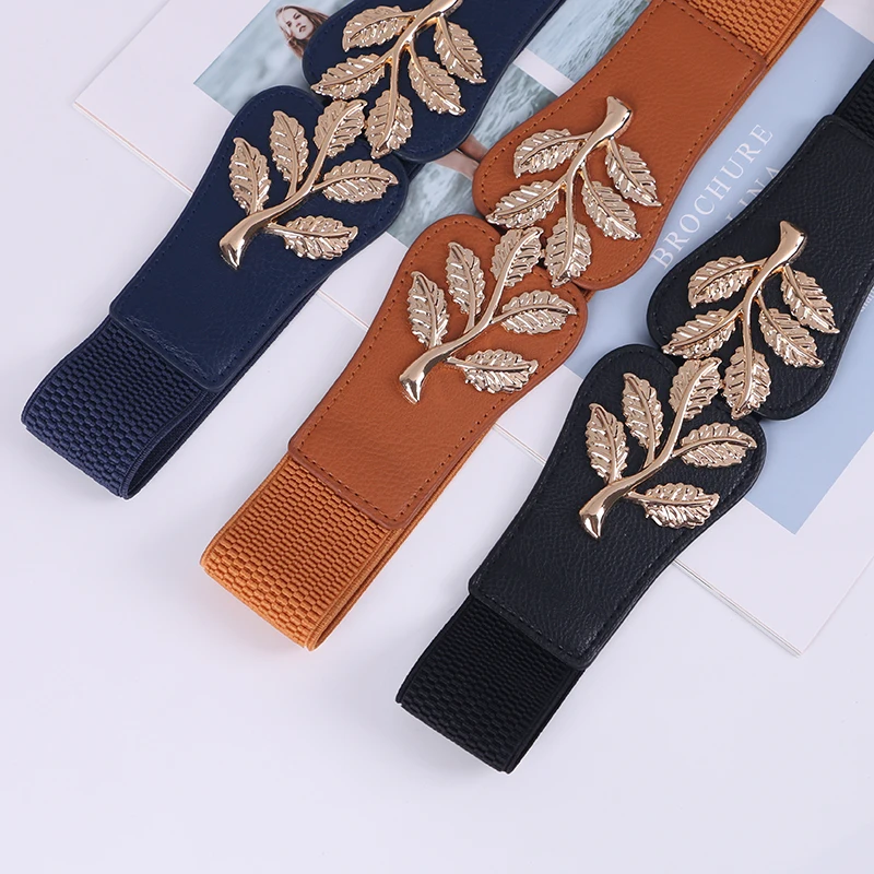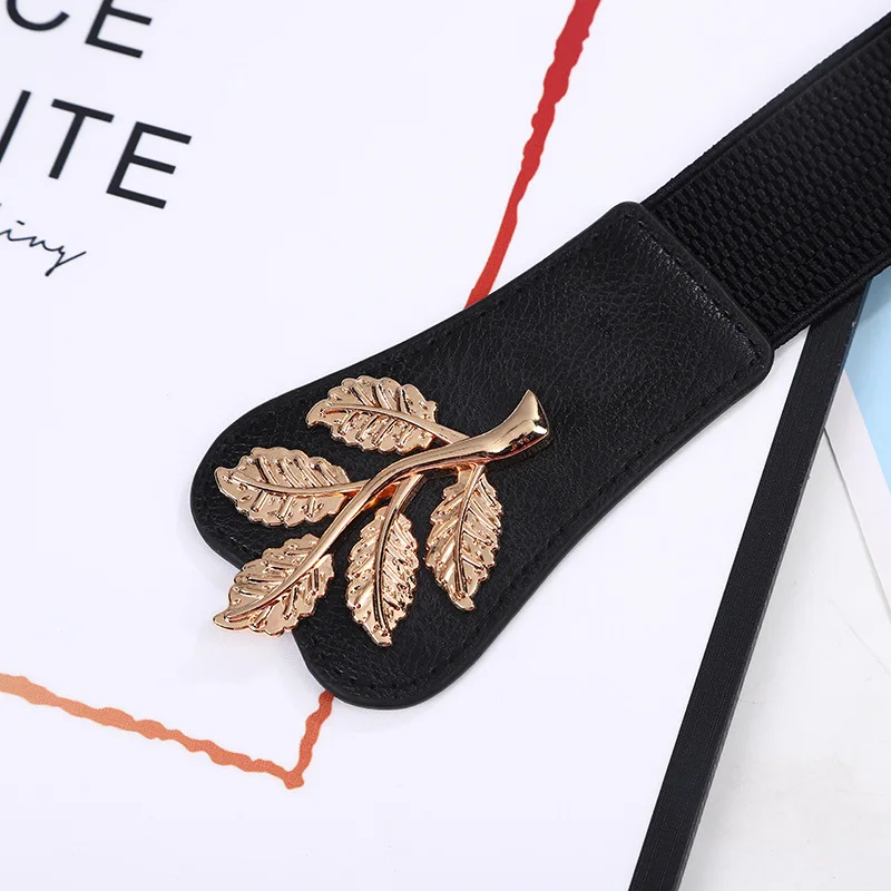 Stretch belt with leaf metal detailing for a defined, elegant fit.
