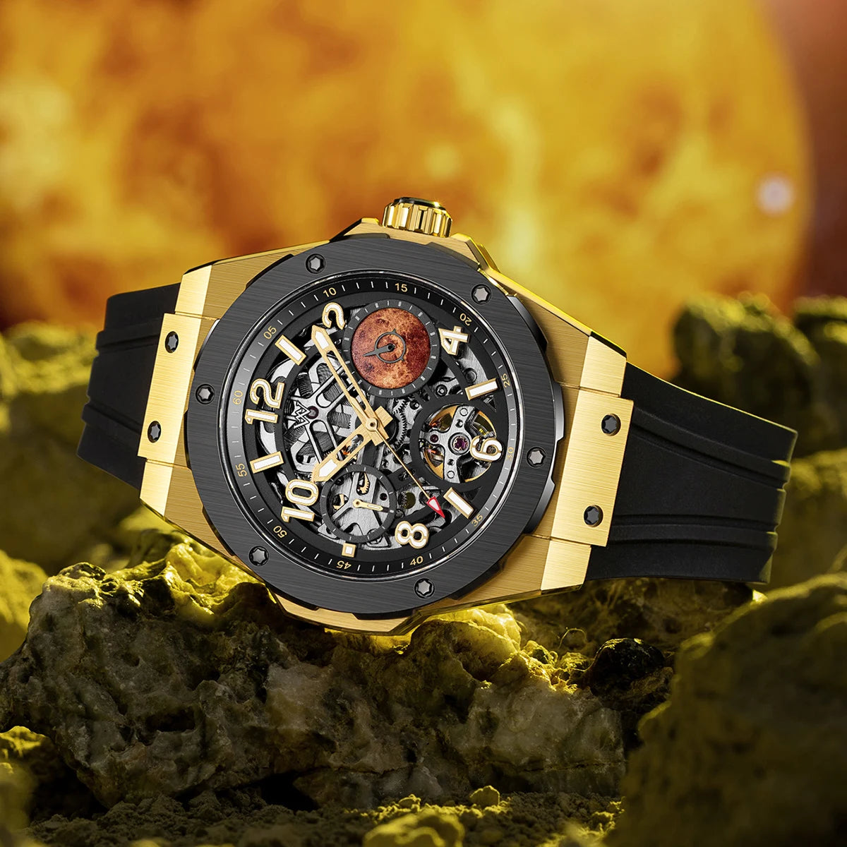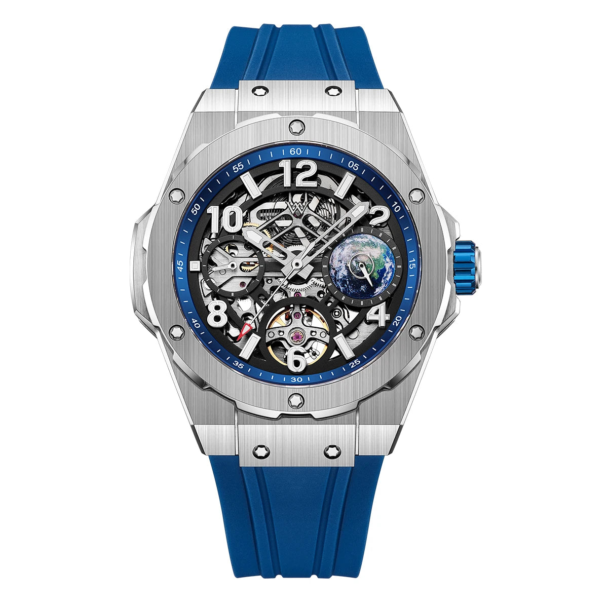 Built for velocity and vision — The Vionne Aeromaster showcases the skeletonized art of momentum. Steel and sapphire, united in precision.