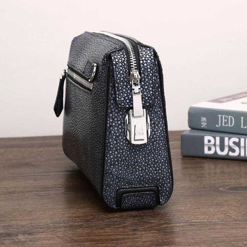 Textured black leather pouch built for travel. Compact, durable, and timeless in form.